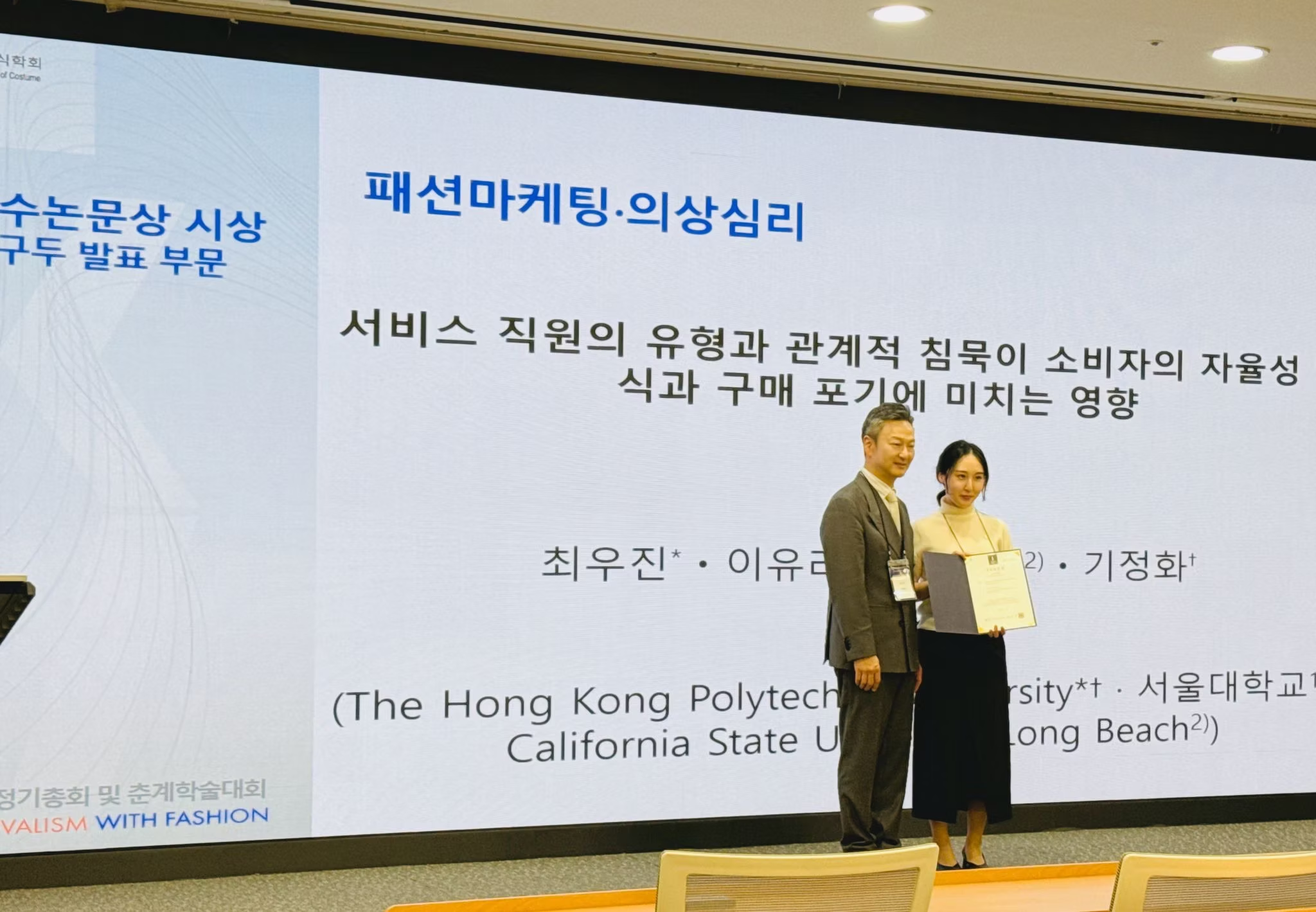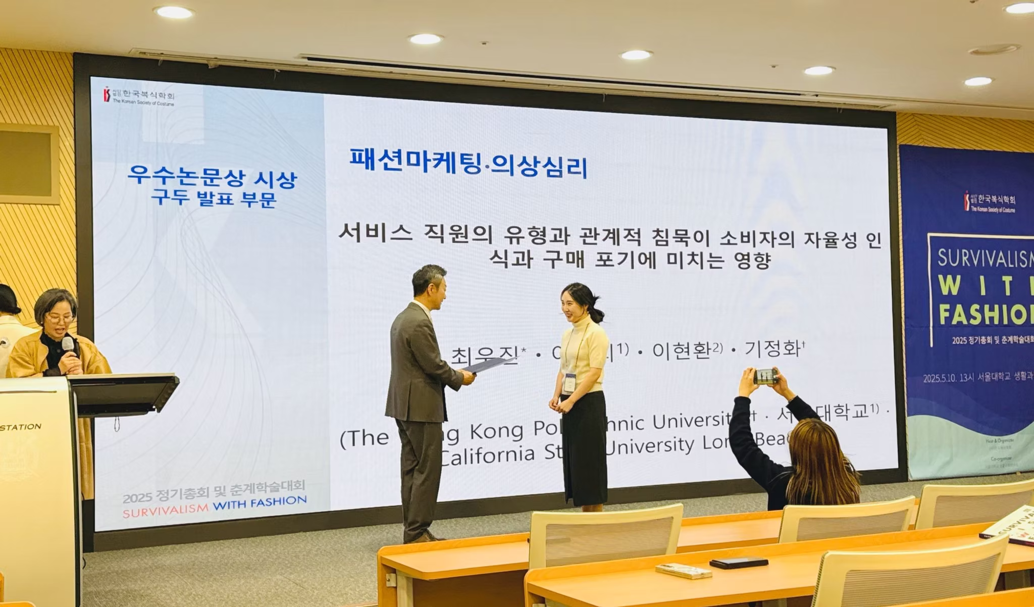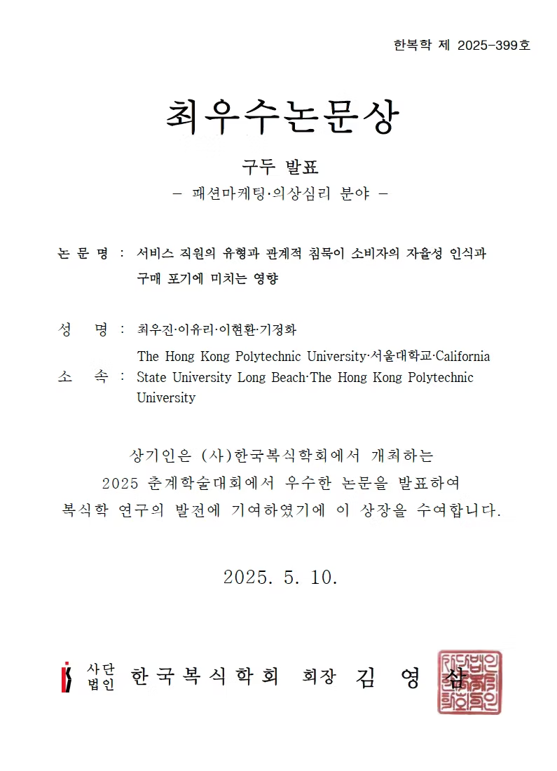 We are pleased to share that Dr. Woojin Choi, our dedicated postdoctoral fellow at SFT and our ai-FaMe lab, has once again won the Best Paper Award for her oral presentation at the 2025 Korean Society of Costume (KSC) conference held on May 10.